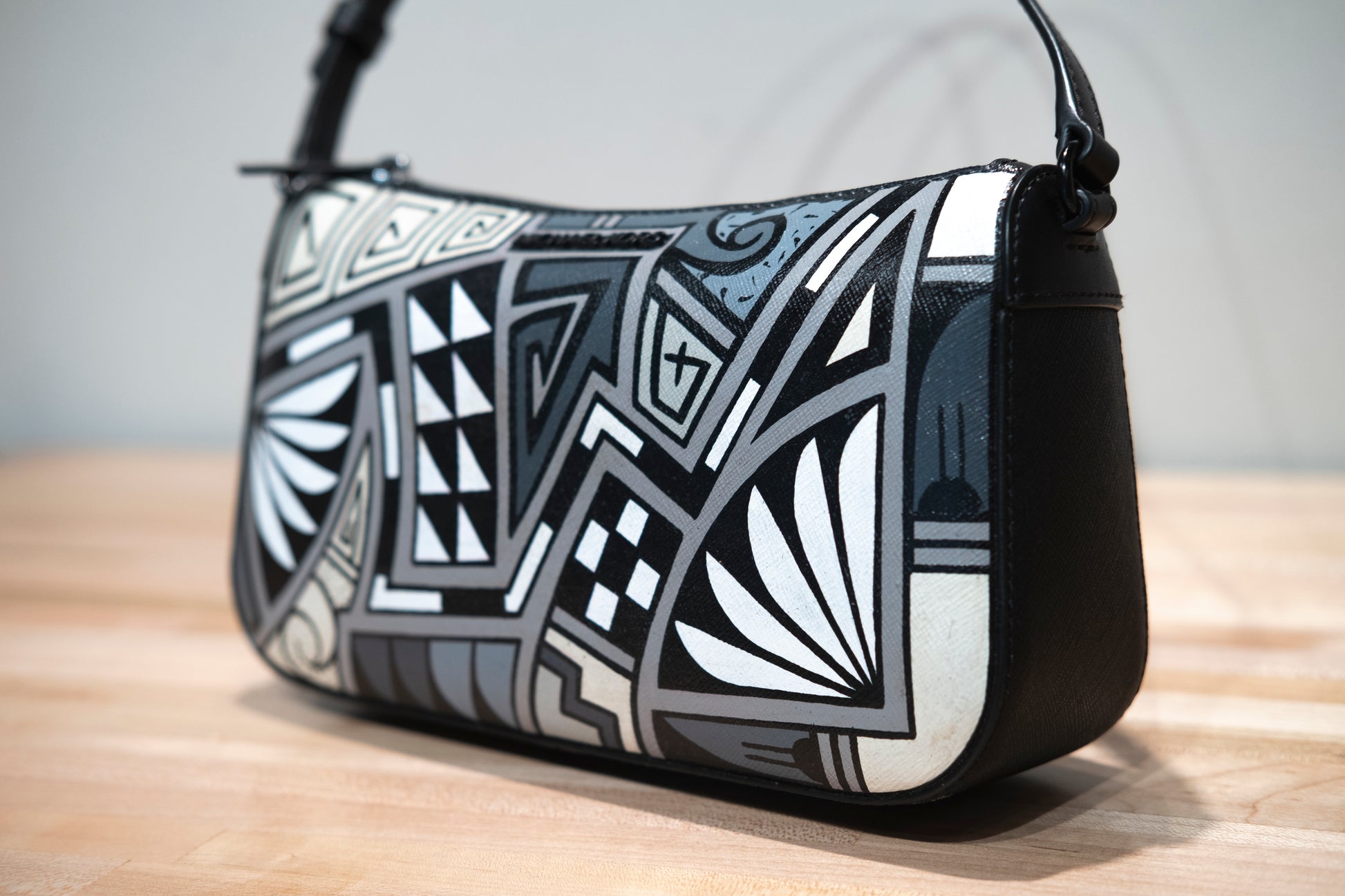 Black leather with black and white paint, varnished for protection and everyday use.